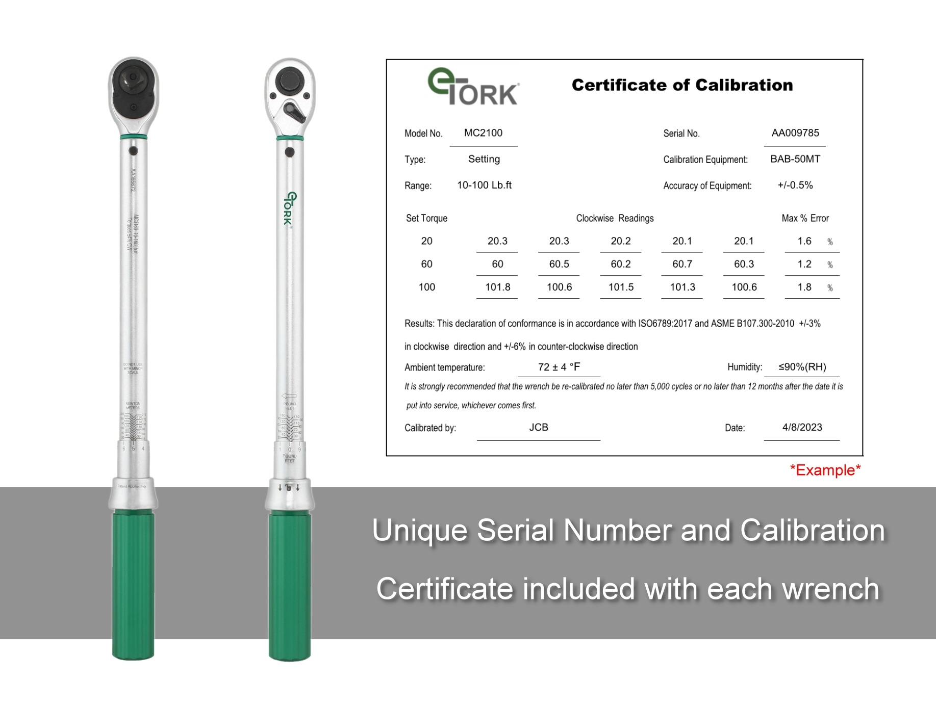 - Each wrench is tested and certified at the factory prior to shipment. Individual certification is included with each wrench.