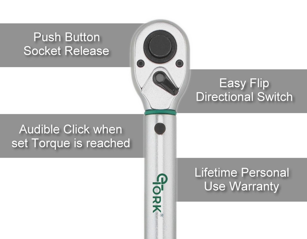 This 1/2 drive torque wrench delivers a torque range of 20-250 ft.-lb. (30-340 N.m) with an accuracy of ±4% in the clockwise direction. Its dual-scale display shows both English and Metric measurements, reducing the chance of setting errors. The wrench clicks and releases once the preset torque value is reached, giving you a clear indication of accurate torque application every time.