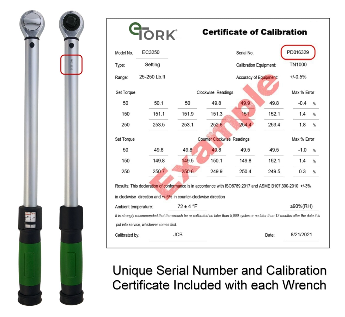 Each wrench is individually tested and certified at the factory to meet stringent accuracy standards. For any service or recalibration needs, you can rely on eTORK’s Factory Repair and Calibration Center in Roswell, GA, ensuring the tool’s long-term reliability.